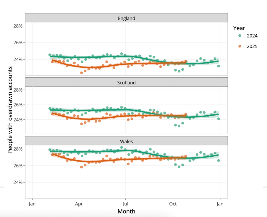 Nationally, the proportion of overdrawn accounts tracked 1% below 2024 for the first half of 2025. By autumn, that gap had narrowed to 0.5%, and levels are now edging above 2024 figures, though still following a similar seasonal pattern.