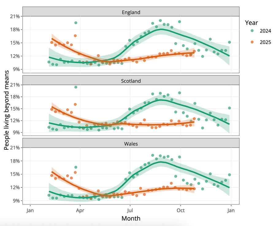In all three nations, the first half of the year saw a decline in people living beyond their means. In 2024, a notable summer spike emerged before easing into autumn (with a small festive rise). In 2025, no such spike is present, though there is a slight increase later in the year.