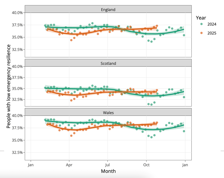 Across GB, resilience levels tracked 1–2% below 2024 until summer, when the proportion of people with under £100 in their account overtook 2024 levels and has continued climbing.