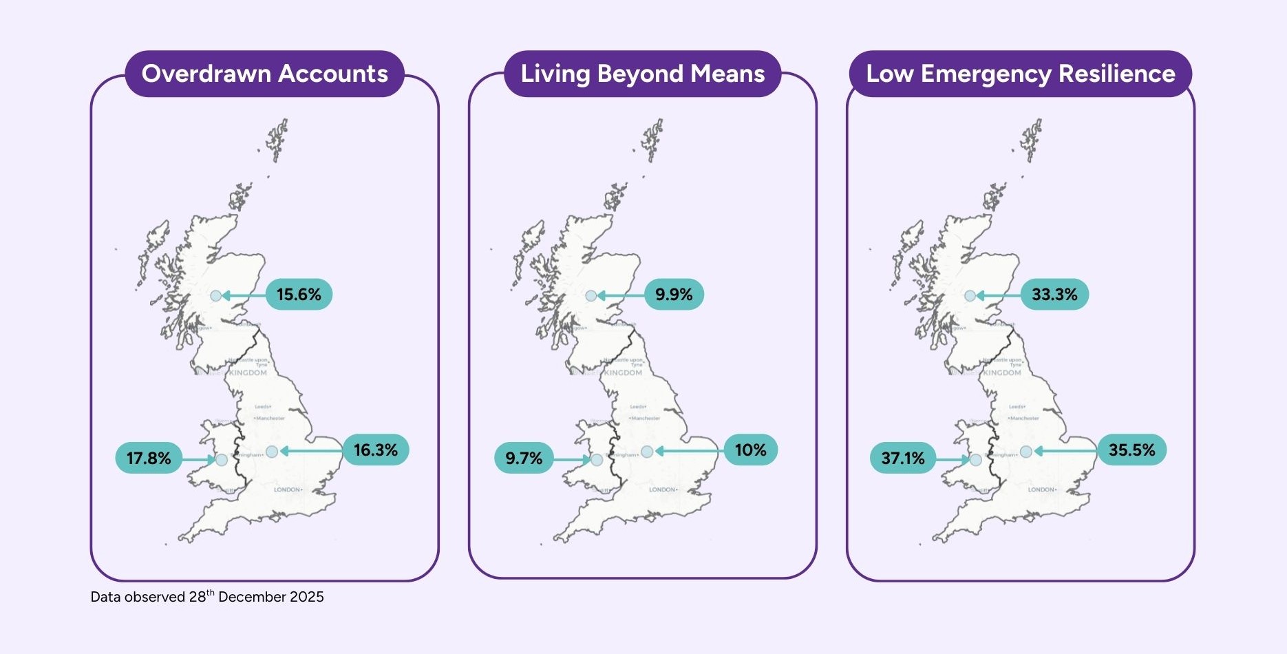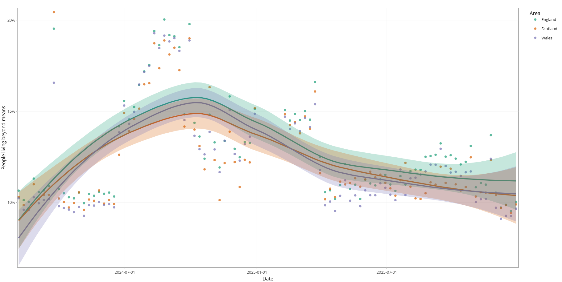 Living beyond means typically is the most closely tied data point across regions, currently within 0.3 percentage points difference between Scotland, England, and Wales, while overdrafts and emergency resilience have larger gaps.
