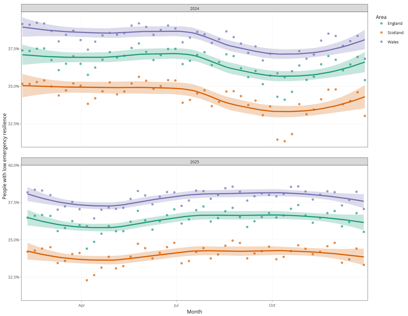 We can see that there has been a difference in trends compared to 2024 where Low Emergency Resilience increased in the lead up to the end of the year, while this year there was a decrease. While this decrease was slight, it is a visual difference in behaviour compared to the prior year. However, the actual percentage of account holders having LER is very similar year-on-year, with 2024 rates sitting at 36.83% for Wales, 35.42% for England, and 33.03% for Scotland.