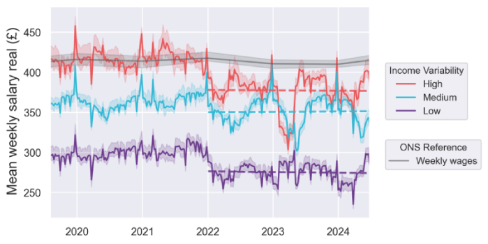 Figure 1: Mean weekly salaries in real terms by income variability. Nominal data is adjusted by CPIH from ONS. Source: The Productivity Institute Lab with data from Smart Data Foundry (SDF) and ONS.