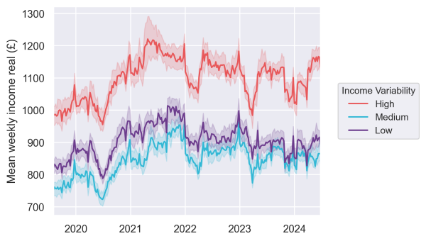 Figure 2: Mean weekly income over time by income variability categories from FINDS/SDF. Nominal data is adjusted by CPIH from ONS. Source: The Productivity Institute Lab with data from Smart Data Foundry (SDF) and ONS.