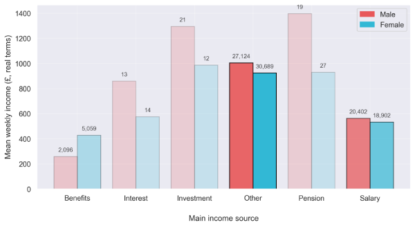 The upward shift in the y-axis confirms that other income streams contribute meaningfully to overall earnings. The SDF ‘Income Sources’ dataset allows us to examine total income patterns across groups of people classified by their main source of income (e.g. salary, benefits, or other). For example, Figure 3 shows the average weekly total income for the 30-34 age band, disaggregated by sex. The transparency of each bar represents the number of accounts for that group, i.e. the total number of observations. For reference, we also include the actual number of observations on top of each bar.