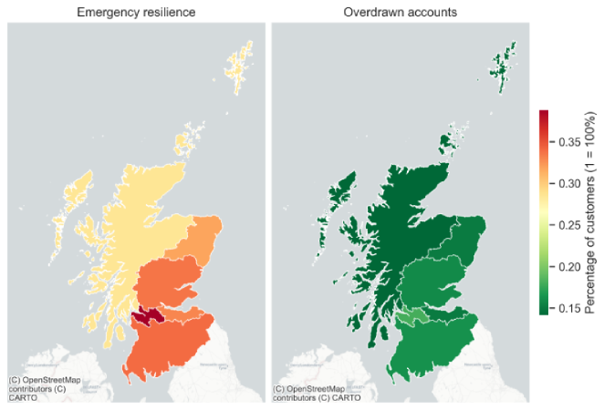 Figure 5: Emergency Resilience and Overdraft ratios for Scotland at ITL2 level. Source: The Productivity Institute Lab with data from Smart Data Foundry (SDF) and ONS.
