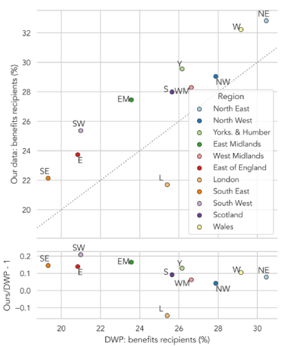 To illustrate the representativeness of their data, Smart Data Foundry provide several analyses, starting with a random sample from NWG for 1.2 million accounts with published national statistics from the ONS, DWP, and Family Resources Survey. We were able to demonstrate that the sample is relatively unbiased in terms of geographic and demographic coverage, income distribution, and representation of major customer groups, including recipients of state benefits and mortgagors (see Figures 6 and 7 for details).