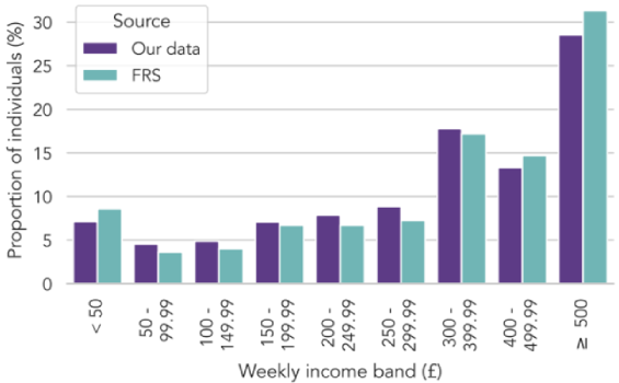 Figure 6: Comparison between the proportion of people receiving benefits by region in the sample and the DWP dataset (2022). Source: Smart Data Foundry | Figure 7: Comparison between the proportion of individuals in the UK by net weekly income band (2022-23) in the sample and the FRS (Department for Work and Pensions, 2024). Source: Smart Data Foundry with data from FINDS and DWP. |