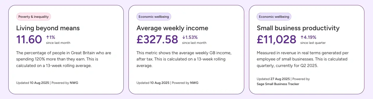The Smart Data Foundry Economic Nowcast has been updated for September 2025, and shows that, at national level, there has been a 1% increase in the proportion of people spending more than their income and a 1.53% decline in average weekly incomes.