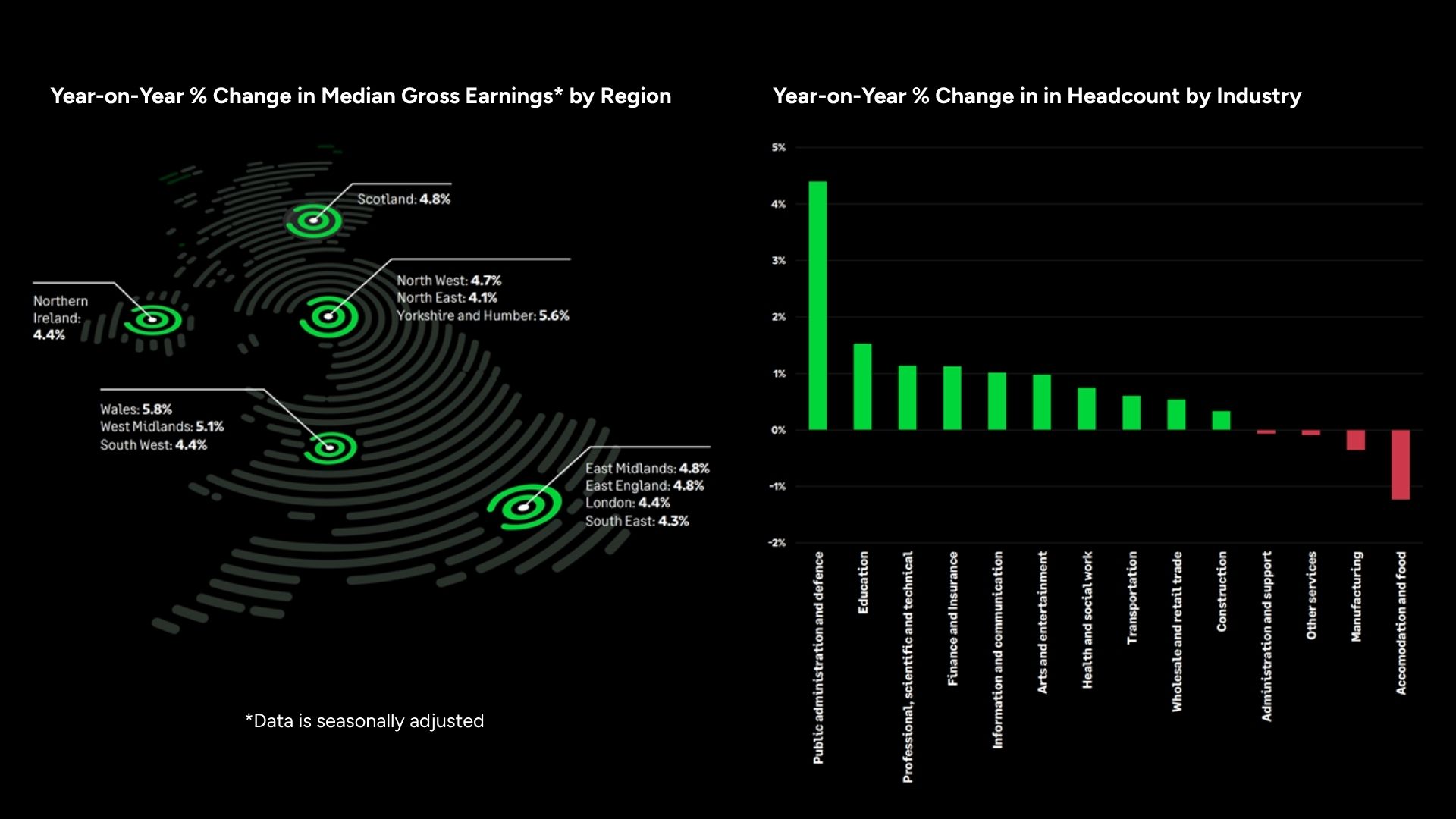 - Median gross earnings: £2,186, up 4.9% year-on-year